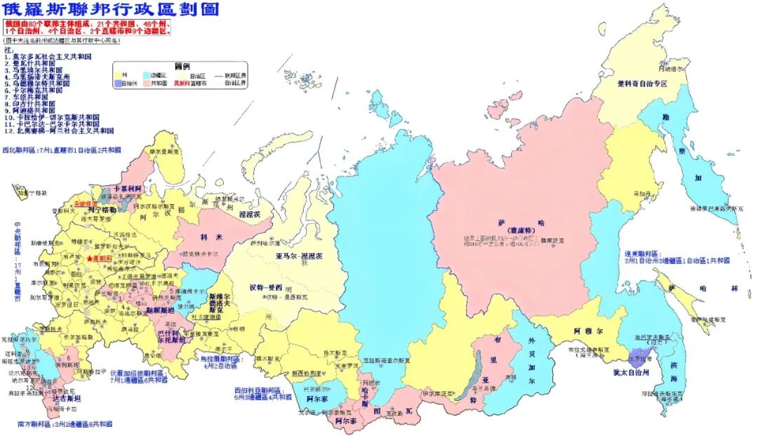 俄罗斯分为多个州和自治区,首都为莫斯科。